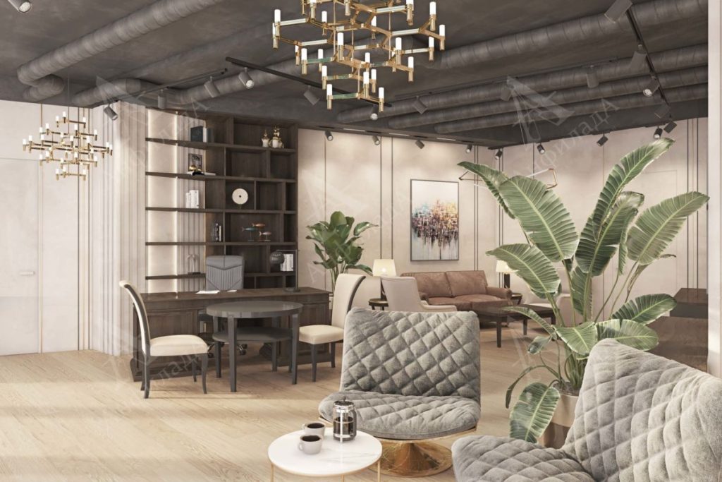 Это пространство для общения с коллегами, партнерами и клиентами. Ее удобно выделить с помощью ковра и мягкой мебели. Достаточно разместить два комфортных кресла или компактный диванчик и небольшой журнальный столик.